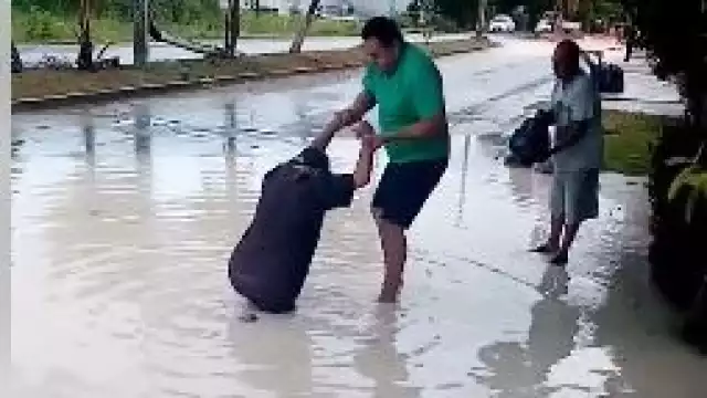 Hombre cae a una zanja en una calle inundada en Chetumal
