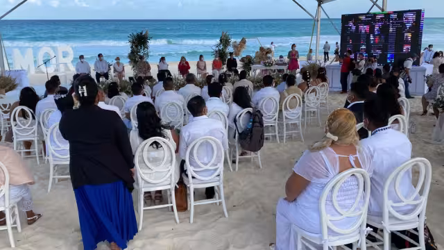 Parejas celebran bodas colectivas frente al mar en Cancún: VIDEO