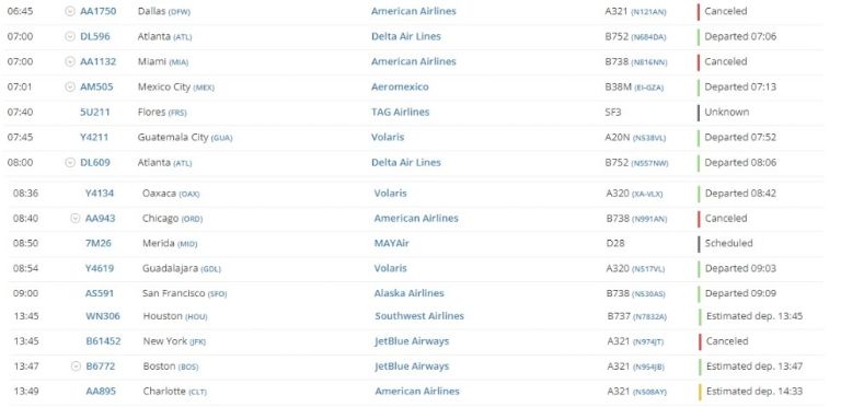Así mismo, se observó que los vuelos AA1750, AA1132, AA943 de American Airlines, con destinos a Dallas, Miami y Chicago; además de la salida B61452 de JetBlue, hacia Nueva York, aparecen marcados de color rojo y con la leyenda 'cancelled del lado derecho de la tabla.