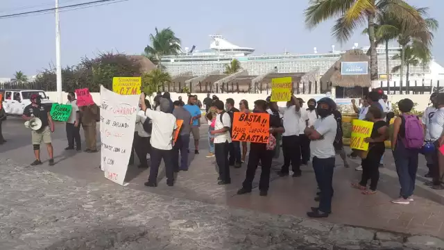 Los empleados gritaron consignas en contra de la CTM y su dirigente en Cozumel, Geny Canto, a quien señalan principales artífices de la "ordeña" de Propinas, que es con lo que ayudan a sus familias.