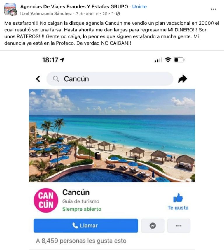“Nuestra dirigencia nacional ha estado bastante insistente porque ha habido muchos fraudes desde el año pasado; agencias que se comercializan en Facebook, que ponen, por ejemplo, el paquete a parques de Cancún a un precio muy bajo y la gente cae. Les piden tarjetas de crédito o que hagan transferencias y de ahí no vuelven a saber de esa pseudo agencia”, comentó.