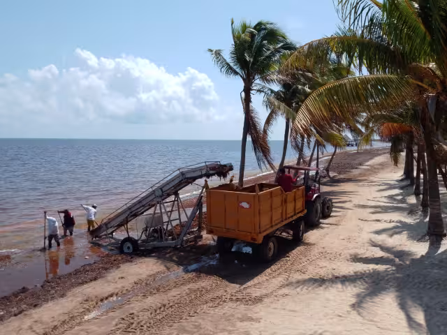 Los trabajos anti-sargazo están a todo lo que dan en la Playa Coral en Cancún; este arenal ostenta la bandera "blue flag" de certificación internacional