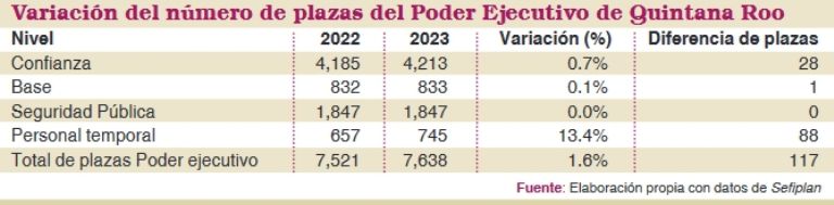 De acuerdo con el Anexo 3 del Presupuesto de Egresos 2023 del Estado de Quintana Roo, por tipo de nivel, las plazas de confianza ascendieron de 4 mil 185 a 4 mil 213 puestos. Si bien, en el ajuste suman 28 nuevos empleos dentro de las dependencias del Poder Ejecutivo quintanarroense, algunos cargos también disminuyeron.
