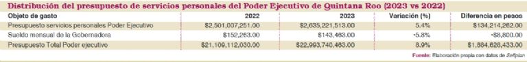 Respecto a las remuneraciones que percibirán los servidores del Poder Ejecutivo, se observan disminuciones en los topes máximos, por ejemplo, el sueldo mensual de la titular del Gobierno Estatal de Quintana Roo pasó de 152 mil 263 pesos al mes a 143 mil 463 pesos, lo que representa un total de un millón 721 mil 556 pesos al año.
