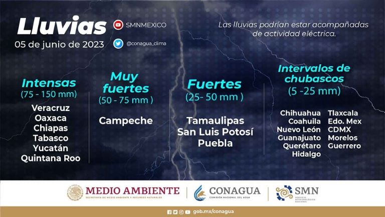 De acuerdo con la información brindada por la Comisión Nacional del Agua (Conagua) y el Servicio Meteorológico Nacional (SMN) se pronostican por los canales de baja presión que hay sobre la Península de Yucatán y el noroeste, norte, centro y sureste de México, la entrada de humedad proveniente del Golfo de México y el Océano Pacífico e inestabilidad en niveles altos de la atmósfera ocasionarán lluvias intensas (de 75 a 150 mm) en regiones de Quintana Roo.