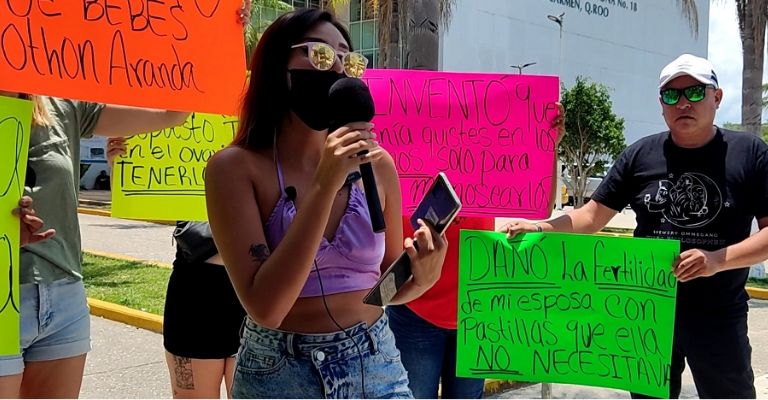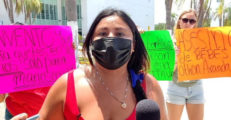 La mujer, de Playa del Carmen, respaldada por otras mujeres que sostenían pancartas, aseguró que ha conocido a otras mujeres que lo acusan de haberles practicado cesáreas prematuras. "Inventar enfermedades es su forma de obtener dinero de sus víctimas. Deberían verificar su consultorio para que vean qué tipo de persona es", agregó.