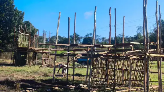 A marchas forzadas trabajan los palqueros de la agrupación 21 de marzo para concluir el ruedo taurino en el local de la feria de la primavera, donde por primera vez se realizarán los eventos profanos de la tradicional fiesta en honor al Niño Dios.