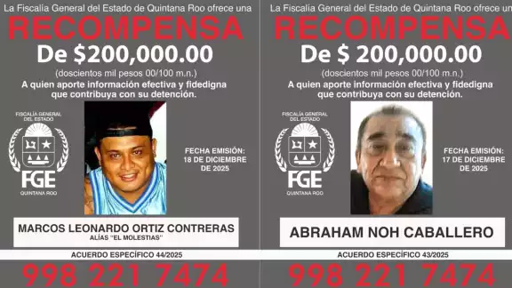 La Fiscalía General del Estado (FGE) de Quintana Roo emitió dos acuerdos específicos de recompensa, mediante los cuales ofrece 200 mil pesos por cada persona a quien proporcione información efectiva, fidedigna y verificable que contribuya con la detención de dos personas, actualmente requeridas por las autoridades.