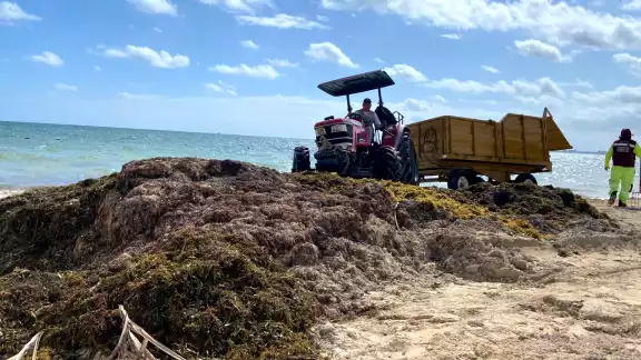 En las playas de Cancún se reactivó la maquinaria (tractores y góndolas) para recolectar la macroalga, labor que anteriormente se realizaba de manera manual.