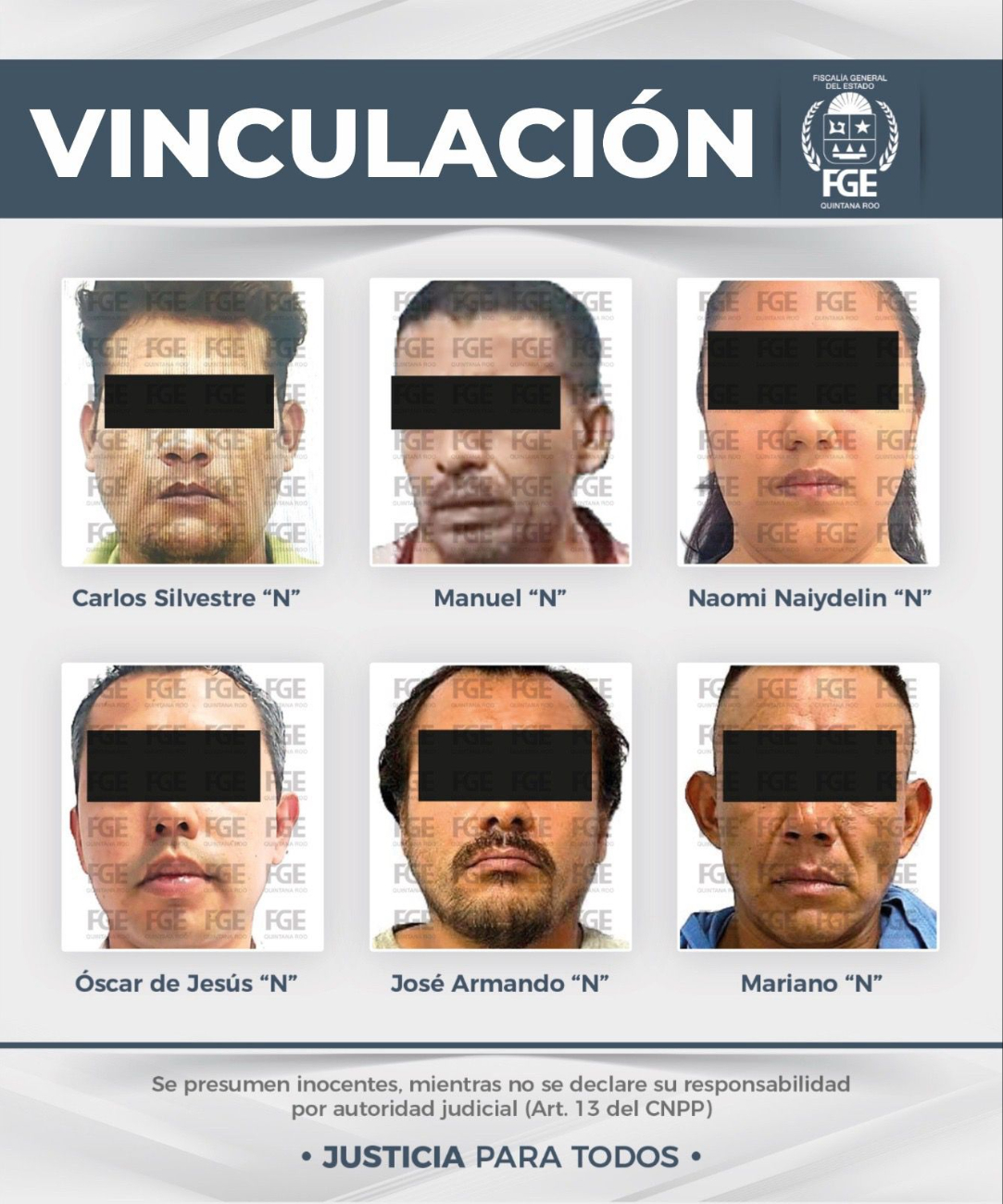Los imputados Carlos Silvestre “N”, Julio Isaías “N”, Óscar de Jesús “N”, Naomi Naydelin “N”, José Armando “N”, Fernando “N” y Jorge Abraham “N”, quedaron bajo la medida cautelar de prisión preventiva justificada por el tiempo que dure el proceso judicial.