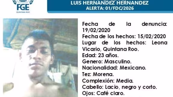 La Fiscalía General del Estado actualizó la ficha de búsqueda 01/FDC/2026 para reforzar la localización de Luis Hernández Hernández, desaparecido desde el 15 de febrero de 2020 en la localidad de Leona Vicario, municipio de Puerto Morelos. La medida se emitió tras seis años sin resultados en el expediente, que permanece vigente.