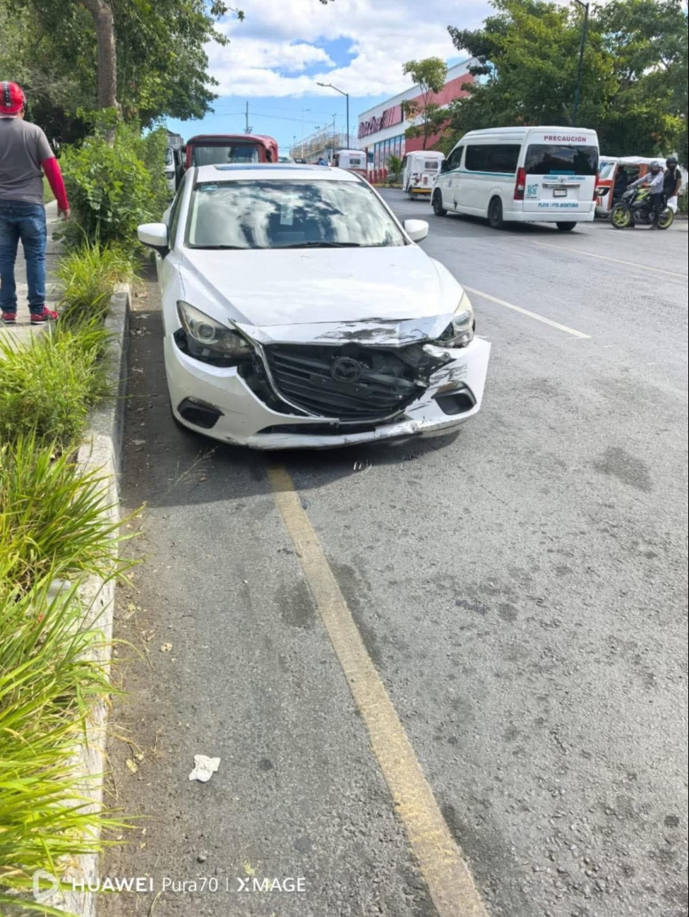 Puerto Aventuras, Quintana Roo.— Un accidente vehicular ocurrido en la calzada Puerto Maya, a la altura de la base de mototaxistas ubicada en la zona de la multiplaza del fraccionamiento Puerto Aventuras, dejó como saldo tres personas lesionadas, entre ellas una menor de edad.