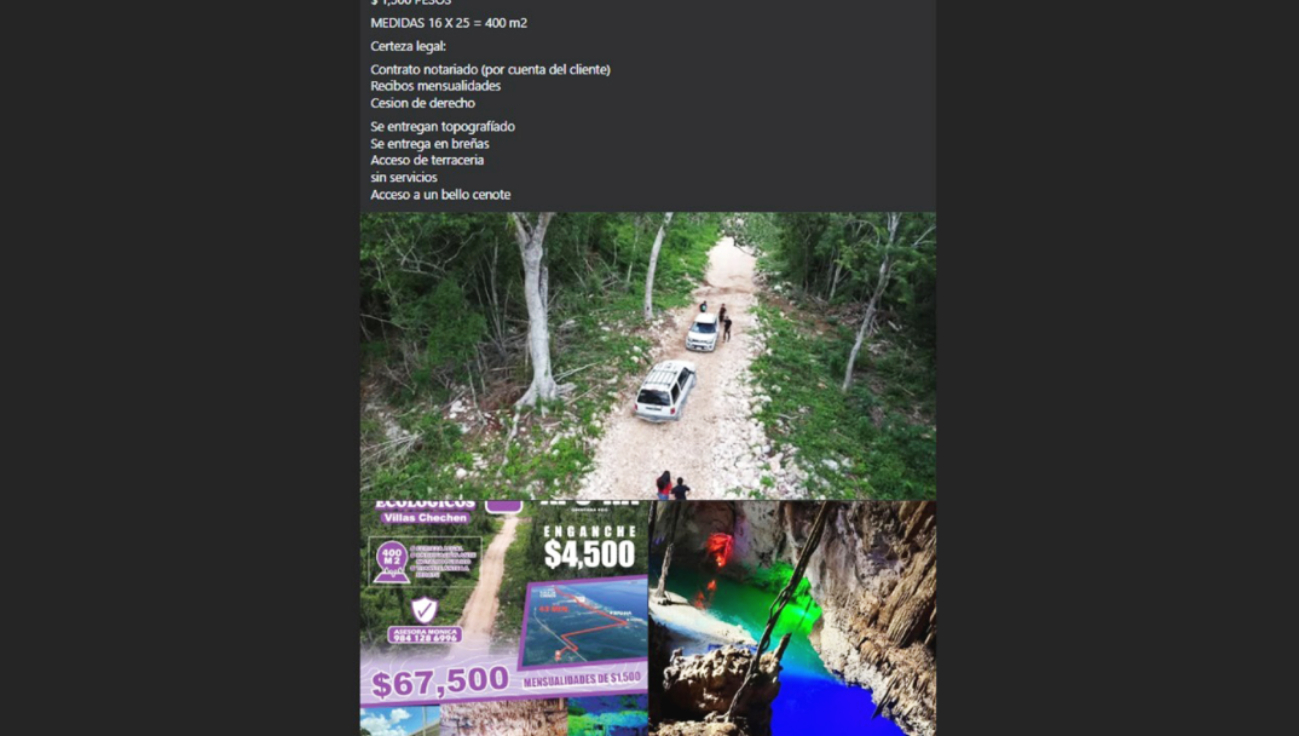 Bajo este esquema, los predios se ofertan a costos muy por debajo del mercado, acompañados de promesas como accesos definidos, calles trazadas, planos, escrituras y hasta la cercanía de cenotes. Sin embargo, al establecer contacto, los supuestos vendedores solicitan un “apartado” o enganche de entre 10 mil y 50 mil pesos, respaldado únicamente por un recibo simple, con el argumento de iniciar la construcción y asegurar el precio preferencial.