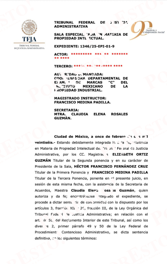 La Sala Especializada en Materia de Propiedad Intelectual publicó, el 30 de marzo del 2026, el expediente 1346/25-EPI-01-9, que tenía como fecha de presentación ante el Tribunal Federal de Justicia Administrativa, el 4 de agosto del 2025