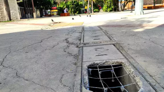 A un año de su reinauguración, el remodelado Parque de las Palapas presenta un notable deterioro: acumulación de basura, tramos del piso fracturados, registros y coladeras sin tapa que representan un riesgo constante, además de cableado y conexiones eléctricas expuestas a la lluvia y al sol, lo que podría provocar cortocircuitos. A ello se suma una maraña de cables visibles en diversas áreas del recinto.
