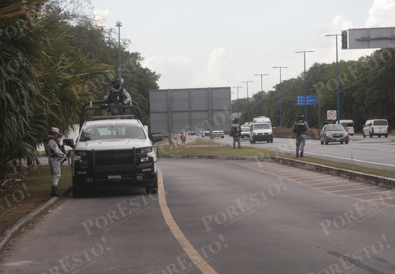 Elementos de la GN se posicionaron en el acceso carretero y al interior del Aeropuerto Internacional de Cancún para realizar recorridos preventivos y garantizar la seguridad de pasajeros y trabajadores.