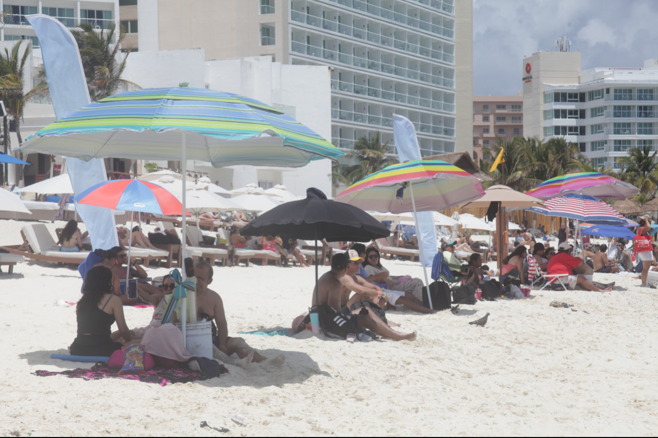 Con un fuerte sol y aguas relativamente libres de sargazo, los bañistas se instalan bajo sus sombrillas y palapas para disfrutar de bebidas frías, botanas y un bronceado.