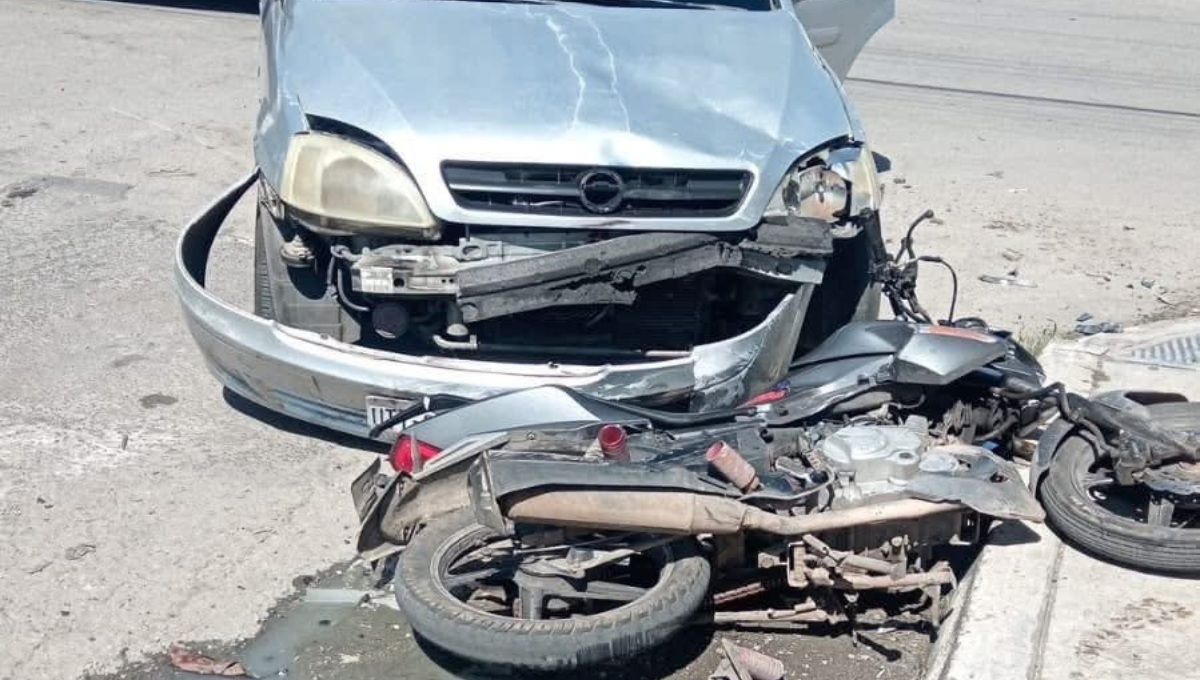 La magnitud del choque fue reflejada en los daños registrados en el auto, el cual resultó con el parachoques completamente desprendida y la luz direccional izquierda rota, mientras en el asfalto permanecían restos de la carrocería. Así como la moto en la que se transporta el joven obtuvo daños en la parte frontal y resultó con el descanso desprendido.