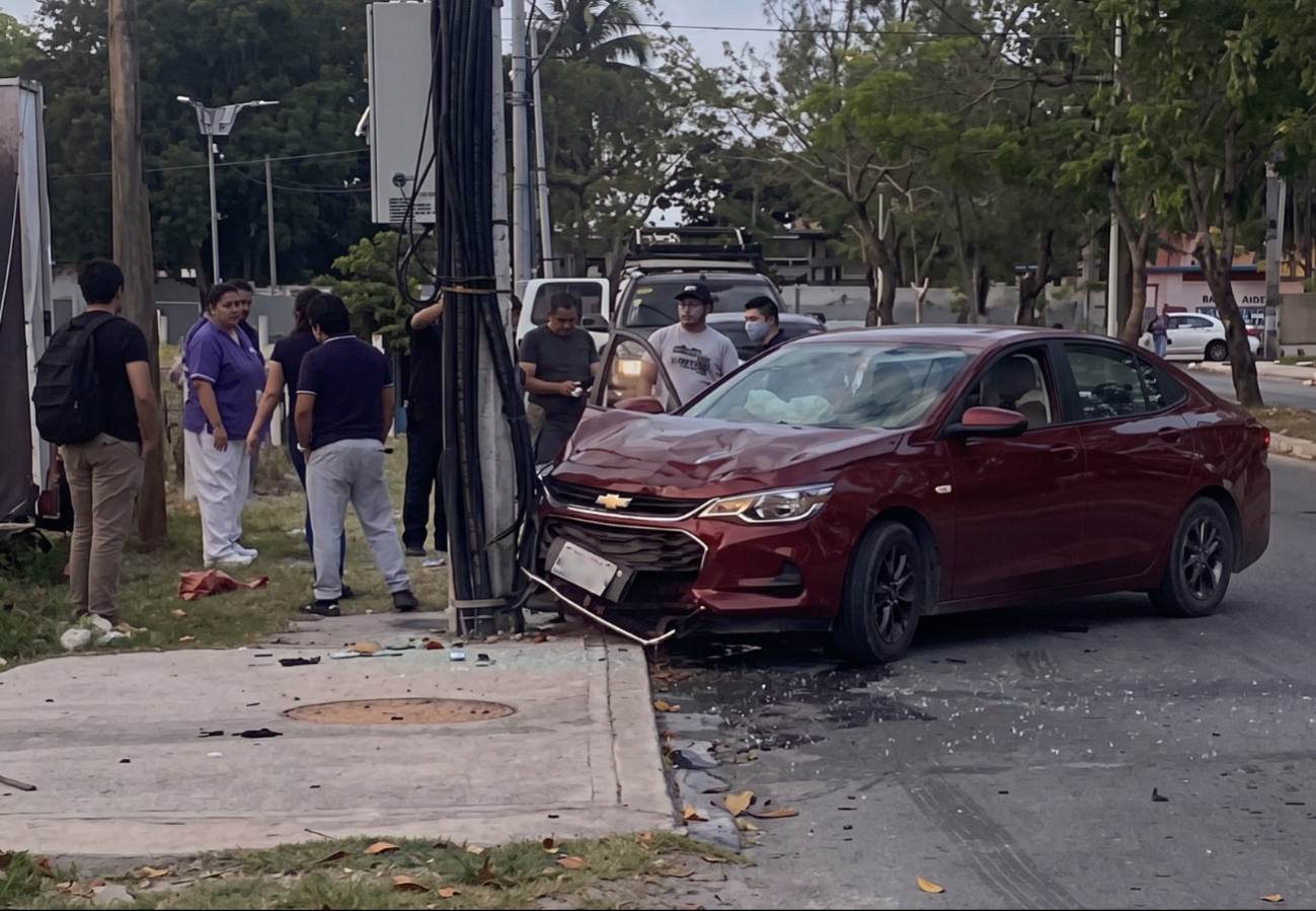 A pesar de la fuerza del choque contra la estructura fija, el poste de la paraestatal se mantuvo en pie, mientras que el vehículo Chevrolet presentó daños de consideración en la parte frontal de su carrocería.