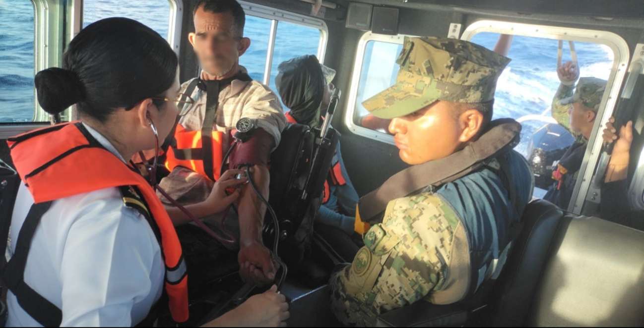 El personal de rescate de la Novena Región Naval rescató a 9 indocumentados cubanos en una embarcación menor hechiza en las inmediaciones de Isla Mujeres, luego que un barco carguero los auxiliara.