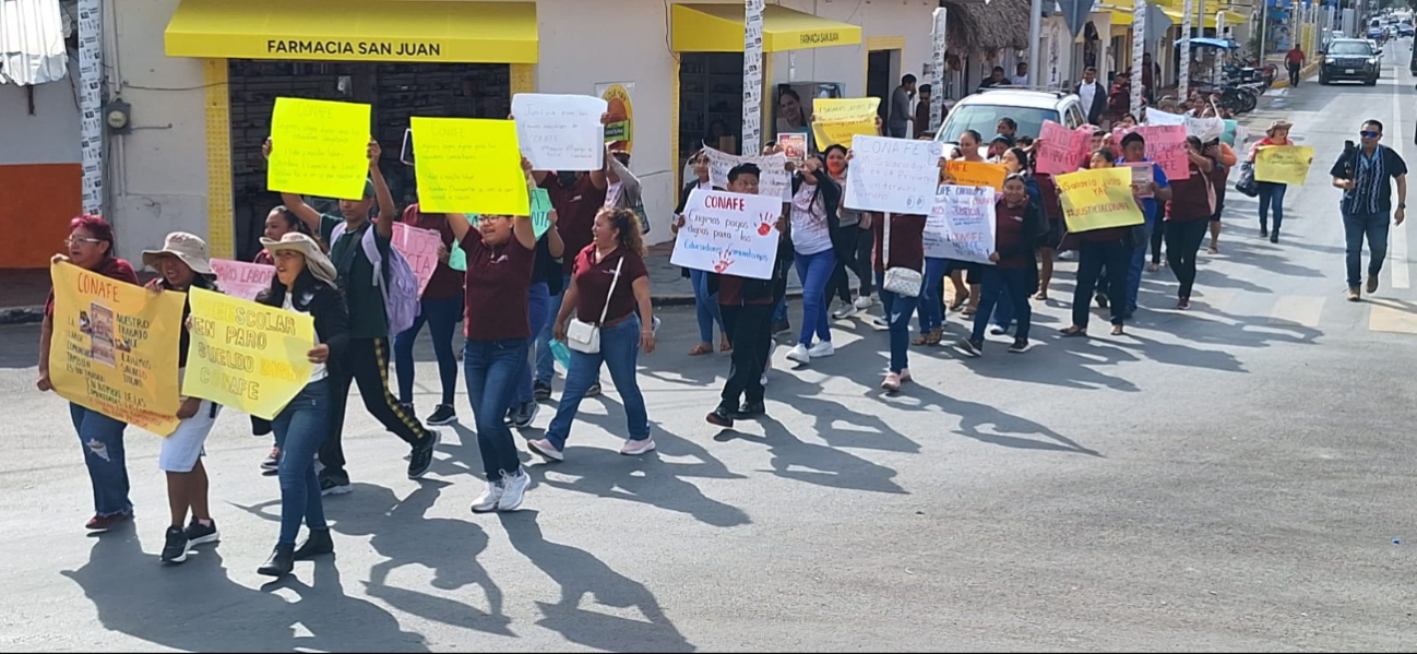 Cerca de un centenar de promotores de la educación en comunidades indígenas, del Consejo Nacional del Fomento Educativo (CONAFE) realizaron una marcha en las principales calles y avenidas de la ciudad, para exigir la federación un salario digno, en su caso se homologado a las becas que se entregan a los Jóvenes Construyendo el Futuro.