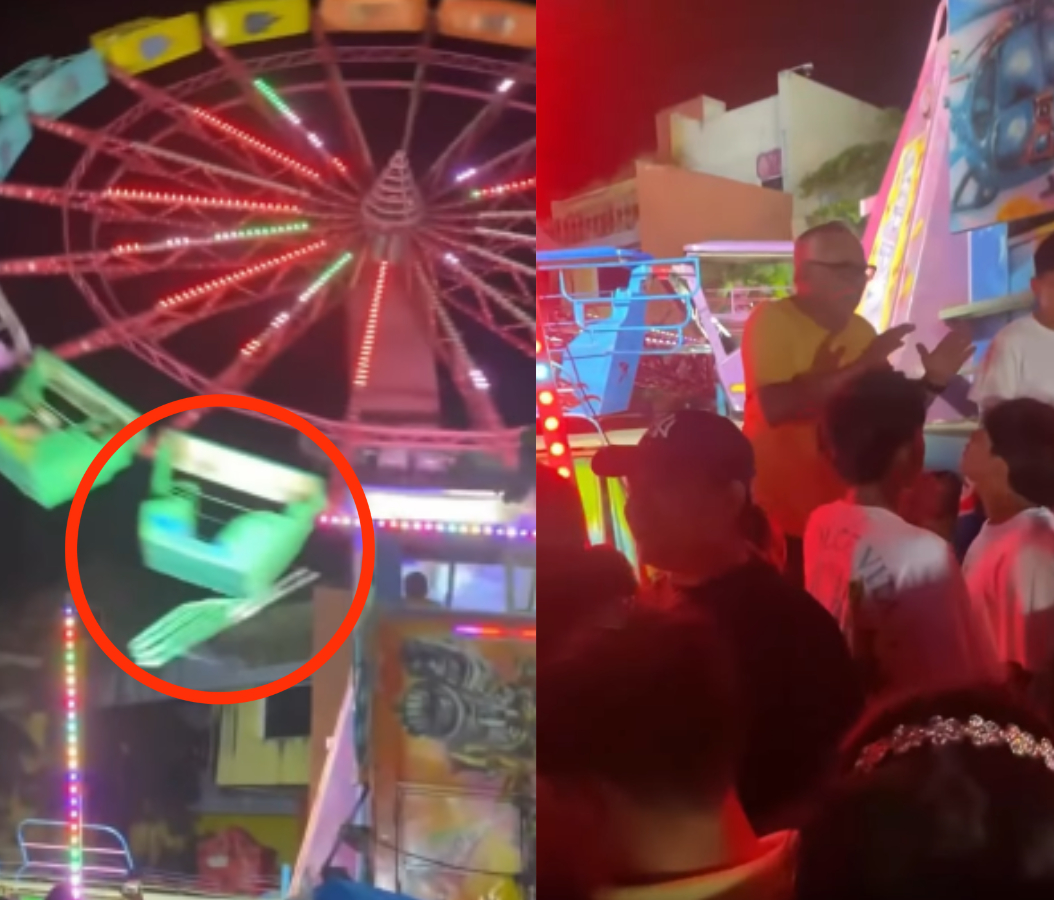 Momentos de angustia se vivieron entre usuarios de un juego mecánico, luego de que una pieza, presuntamente una puerta o componente de la canastilla se desprendiera y cayera al vacío, mientras la atracción estaba en funcionamiento.