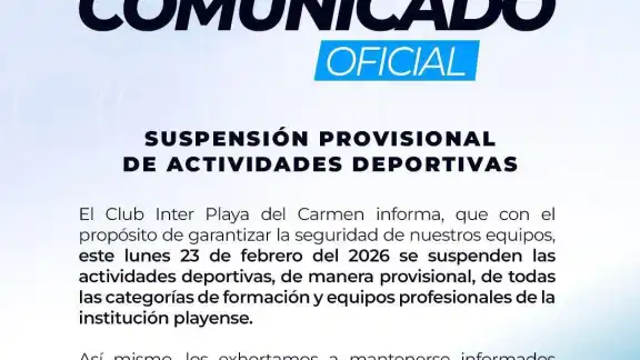 En la que expresan que el “El Club Inter Playa del Carmen informa que con el propósito de garantizar la seguridad de nuestros equipos, se suspenderán de manera provisional, las actividades deportivas el próximo lunes 23 de febrero del 2026.