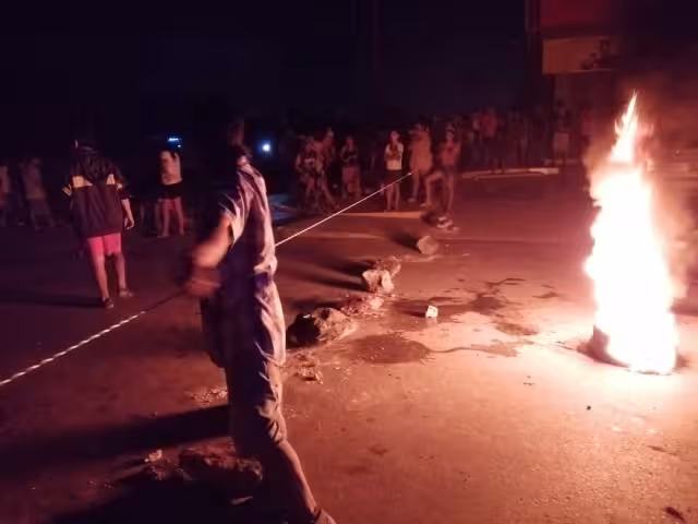 Hombres mujeres y niños habitantes del fraccionamiento Aloja, bloquearon esta noche los carriles del fraccionamiento Arco Vial del lado norte, esto debido a la falta de alumbrado público y agua potable, la cual fue cortada después del paso del Huracán Delta.