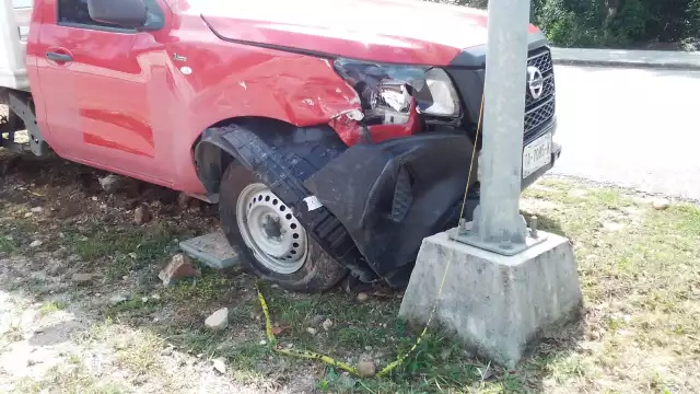 Las unidades involucradas en un choque en la Avenida Colosio de Playa del Carmen resultaron con daños, sobre todo la camioneta de estaquitas, que terminó estrellada contra un poste de luz