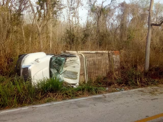 El conductor de un camión de carga quedó atrapado dentro de la unidad tras volcar en una vía de la Zona Maya de Quintana Roo, tramo José María Morelos-Polyuc