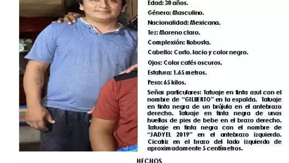 Una de las señas particulares que presenta esta persona, se trata de un tatuaje con tinta azul con la leyenda Gilberto en la espalda, un tatuaje de una brujula en el brazo derecho, tatuaje con el nombre de Jadyel 2019 en el antebrazo izquierdo, una cicatriz del lado izquierdo, de aproximadamente cinco centímetros.