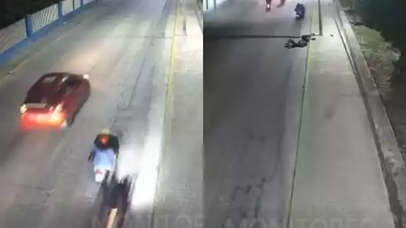 A las 23:12:55 horas rebasó Juan "N" por la derecha a otra motoneta, perdió el control y fue a impactar con el poste de la luminaria de la vialidad, a unos metros antes del monumento al tiburón ballena, según video que liberó el Centro de Comando y Control (C2).