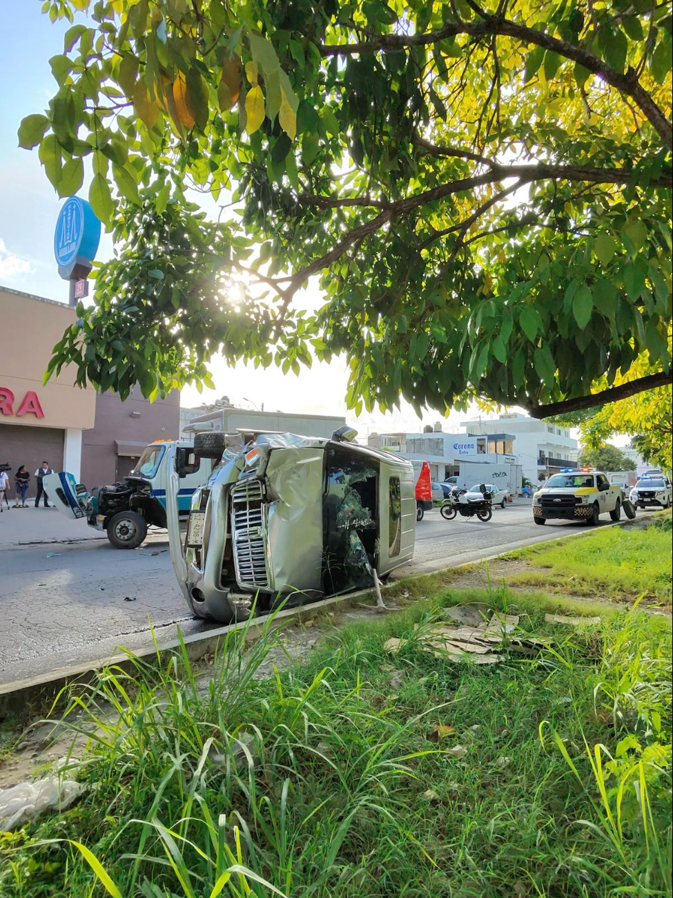 Una camioneta Lincoln volcó tras chocar contra un camión repartidor en el cruce de la avenida 135 y Chupté; el conductor circulaba a exceso de velocidad y fue detenido por su presunta responsabilidad.
