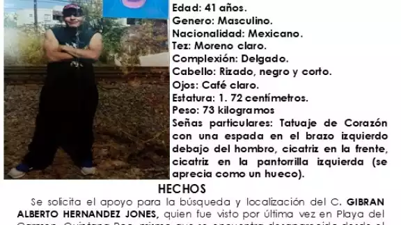 Fue activada una ficha de búsqueda para localizar a Gibran Alberto Hernández Jones, de 41 años, visto por última vez el 24 de diciembre en esta ciudad, reportó la Fiscalía General del Estado (FGE).