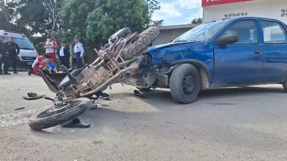 De acuerdo información preliminar que se pudo indagar en el lugar de los hechos se pudo conocer que uno de los vehículos involucrados se trata de un Mazda color azul que circulaba de poniente Oriente Aparentemente al tratar de realizar un cambio de dirección hacia su izquierda provoca ser colisionado por una motocicleta que circulaba en la misma dirección del impacto la unidad ligera quedó encaravado en el vehículo automotor mientras que su operador terminó proyectado sobre el pavimento hasta donde recibió los primeros auxilios.