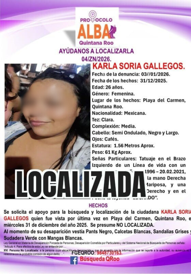 La Fiscalía General del Estado de Quintana Roo desactivó la ficha de búsqueda de Karla N., de 26 años, quien había sido reportada como desaparecida el 31 de diciembre en Playa del Carmen.