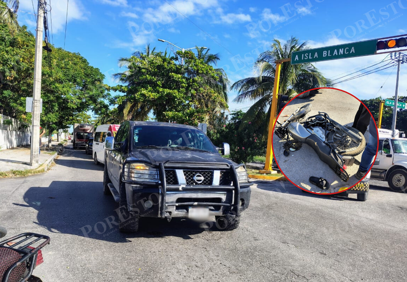 Derivado a semáforos inservibles en el cruce de la avenida bonampak con calle 54 en las inmediaciones de la Supermanzana 75 se generó la colisión entre una camioneta y una motocicleta dejando dos personas lesionadas.