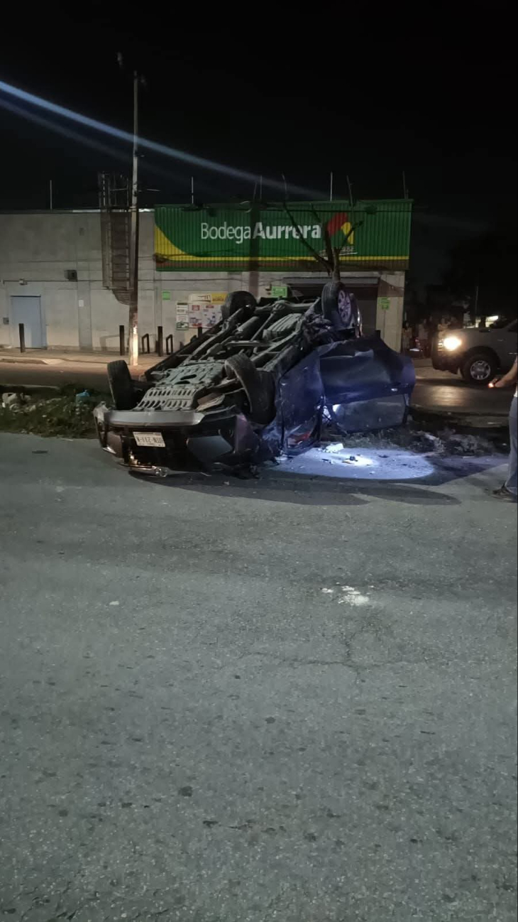 Un aparatoso accidente de tránsito se registró durante la madrugada de este domingo sobre la avenida Costa Maya, a la altura de la región 234, luego de que un vehículo particular terminara volcado sobre el camellón central de dicha vialidad. El hecho fue reportado al número de emergencias 911 por ciudadanos que presenciaron el percance.
