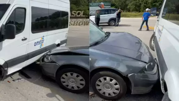 Al aproximarse al acceso del complejo residencial Corasol, una camioneta blanca perteneciente a la empresa de transporte turístico Amstar salió de manera imprudente desde la entrada, atravesándose en la trayectoria del automóvil particular.