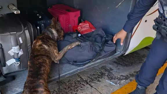 Durante la inspección en el maletero de uno de los autobuses, el ejemplar canino presentó cambios notorios en su conducta, como movimientos constantes de cabeza, jalones de la correa y ladridos, señales entrenadas que indican la posible presencia de sustancias ilícitas.