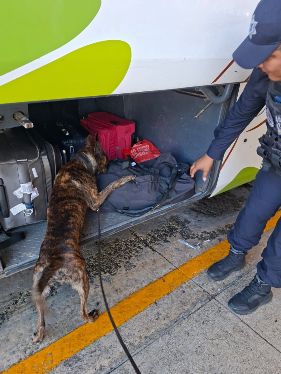 Durante la inspección en el maletero de uno de los autobuses, el ejemplar canino presentó cambios notorios en su conducta, como movimientos constantes de cabeza, jalones de la correa y ladridos, señales entrenadas que indican la posible presencia de sustancias ilícitas.