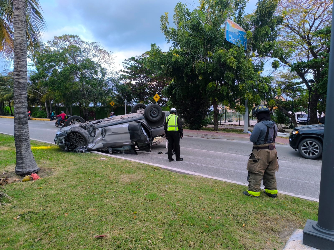 Un aparatoso accidente fue reportado la tarde de este domingo en el kilómetro 3.5 de la zona hotelera, en el sentido hacia el centro de la ciudad, en donde una camioneta tipo Cherokee terminó volcada en medio de la cinta asfáltica, tras recibir el impacto de otro vehículo, con un saldo preliminar de dos personas lesionadas.