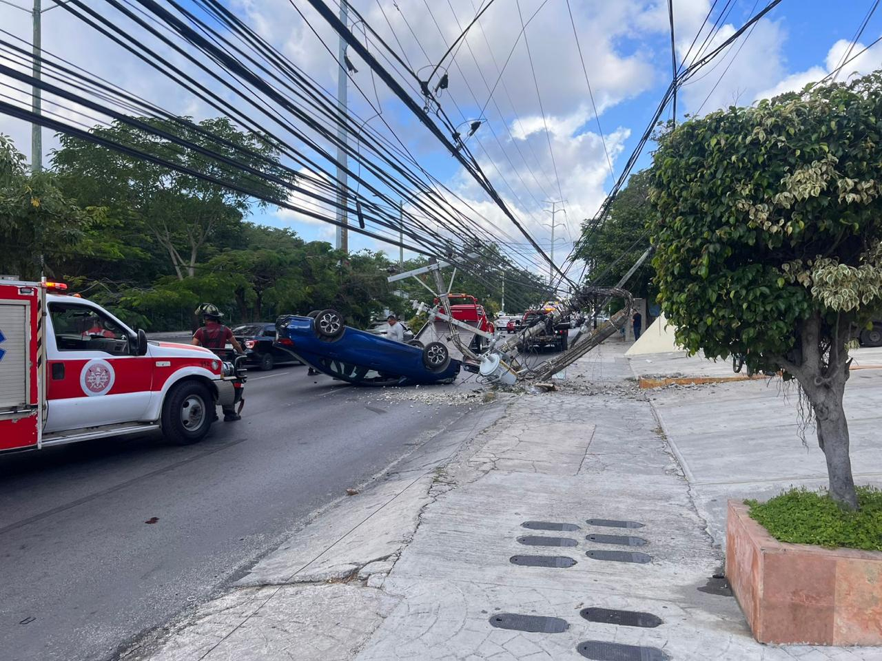 El percance ocurrió alrededor de las 09:26 de la mañana, en el cruce de la avenida Kabah con calle Boca Paila, donde un automóvil particular terminó volcado luego de impactarse contra un poste de concreto del sistema eléctrico. De acuerdo con los primeros reportes, el vehículo involucrado fue un Kia Forte color azul, con placas de Quintana Roo, conducido por Orlando Shaed R. C., de 32 años de edad.