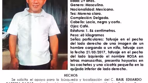 La desaparición de Raúl Eduardo Barrera Bacab, de 29 años de edad, visto por última vez el 21 de febrero de 2026 en la localidad de Leona Vicario, municipio de Puerto Morelos, derivó en la activación de una ficha de búsqueda por parte de la Fiscalía General del Estado de Quintana Roo, instancia que inició el protocolo correspondiente tras la denuncia presentada el 24 del mismo mes y año. El documento oficial quedó registrado con el número de alerta 03/FCD/2026.