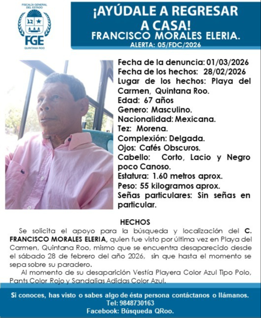 La desaparición de Francisco Morales Eleria, de 67 años de edad, reportado como no localizado desde el 28 de febrero de 2026 en Playa del Carmen, activó la alerta de búsqueda 05/FDC/2026, confirmó la Fiscalía General del Estado tras la denuncia formal presentada este día.