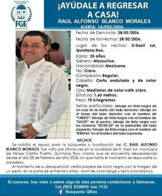 De acuerdo a información dada a conocer por la Fiscalía General del Estado, hizo referencia mediante una ficha de búsqueda que fue activada en las últimas horas, hace referencia que el agraviado se trata de Raúl Alfonso Blanco Mora de 25 años de edad, y que los hechos se registraron el 28 de febrero y que en el mismo día fue interpuesta la denuncia por parte de sus familiares.