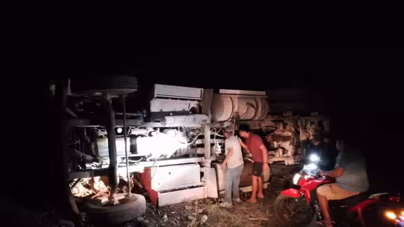 Un tractocamión que transportaba 25 toneladas de vara dulce volcó durante la madrugada en la carretera del ingenio de San Miguel de Rafael de Pucté, en la zona de la ribera del Río Hondo.
