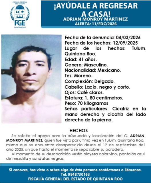 La desaparición de Adrián Monroy Martínez, de 41 años de edad, activó una ficha oficial de búsqueda luego de que fue reportado como no localizado tras haber sido visto por última vez el 12 de septiembre de 2025 en el municipio de Tulum.