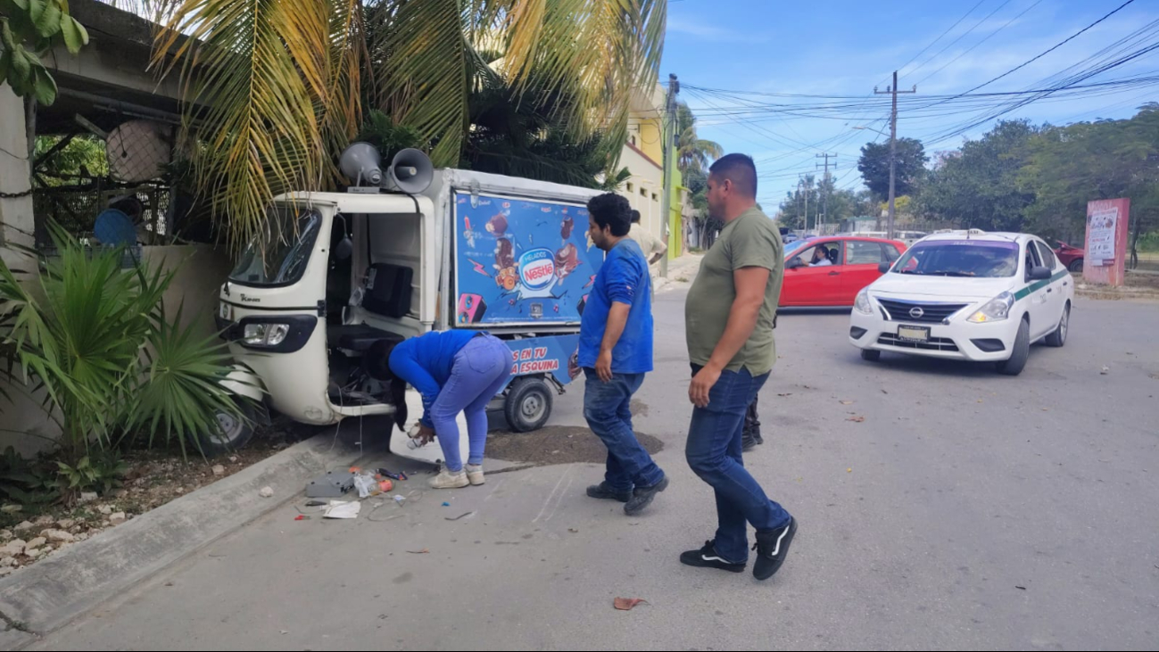 Un aparatoso percance vehicular se registró la tarde de este jueves en las inmediaciones de la Región 221 de Cancún, luego de que un carrito de venta de helados y una motoneta colisionaran en un cruce vial. A consecuencia del impacto, ambos conductores resultaron con lesiones menores, aunque no fue necesario su traslado a un hospital.