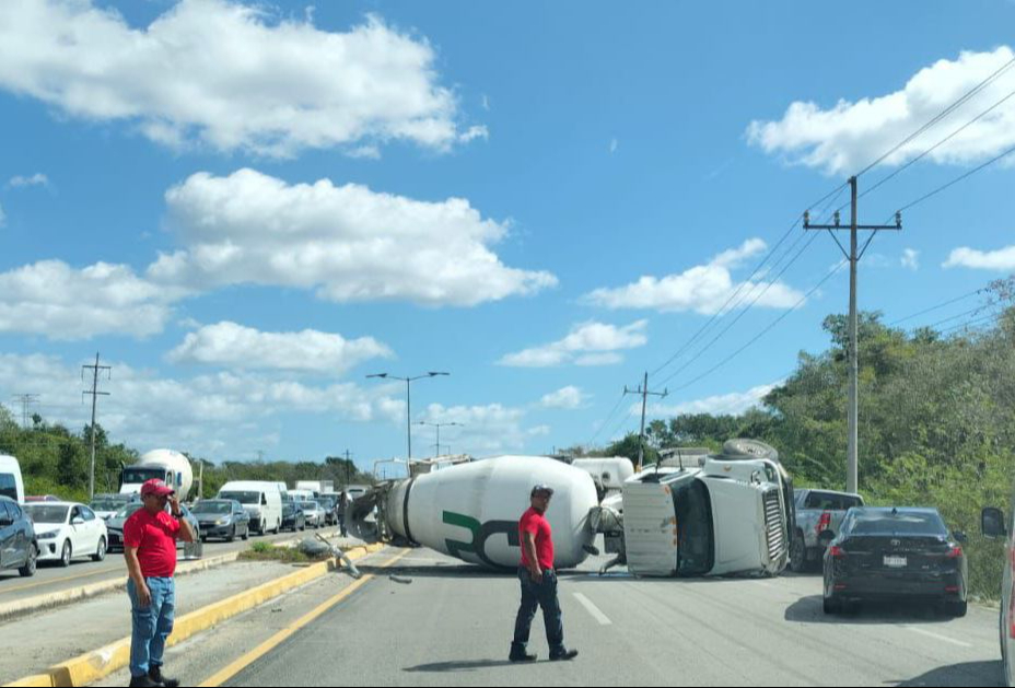 Posteriormente, en el filtro de entrada a Playa del Carmen, se registró la volcadura de un camión tipo revolvedora, cuyo conductor resultó lesionado y fue trasladado a un hospital para valoración médica.